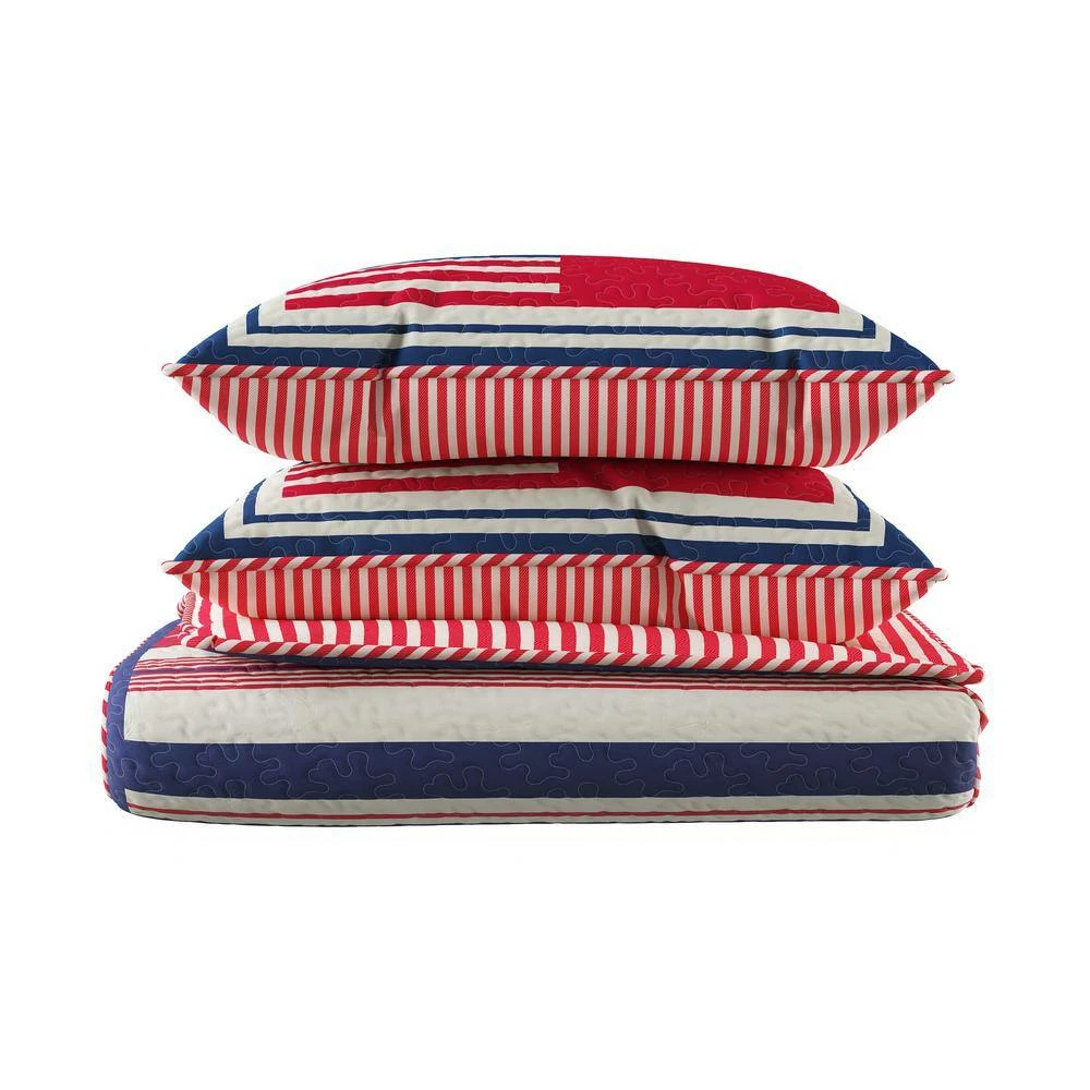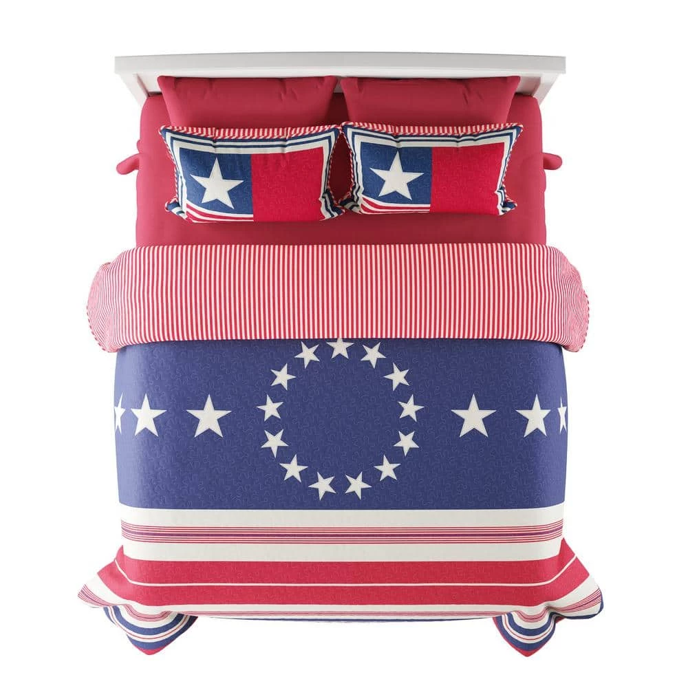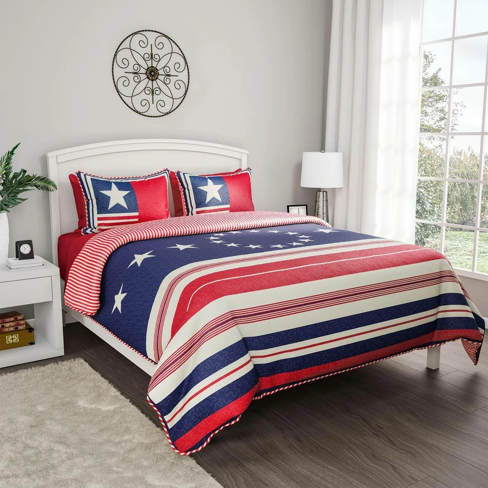 Bring the American flag’s beauty in your room with the Lavish Home 3-Piece Glory Bound Hypoallergenic King Quilt Bedspread Set. Designed by Heather Dutton, this set features attractive stars and stripes print on the face and red and white stars on the reverse for an enhanced visual appeal. The hypoallergenic king quilt is made from high-quality polyester for excellent comfort and safe use. This set includes a bedspread quilt and two shams.