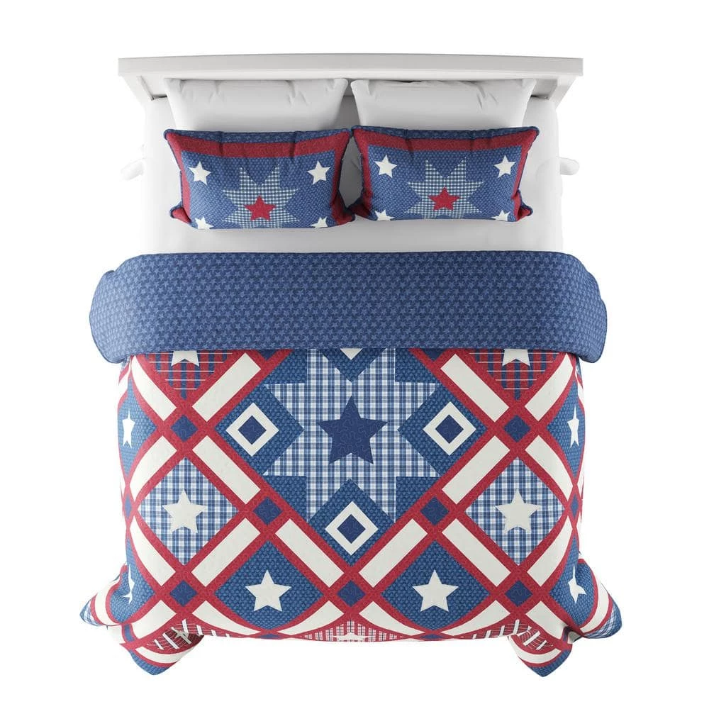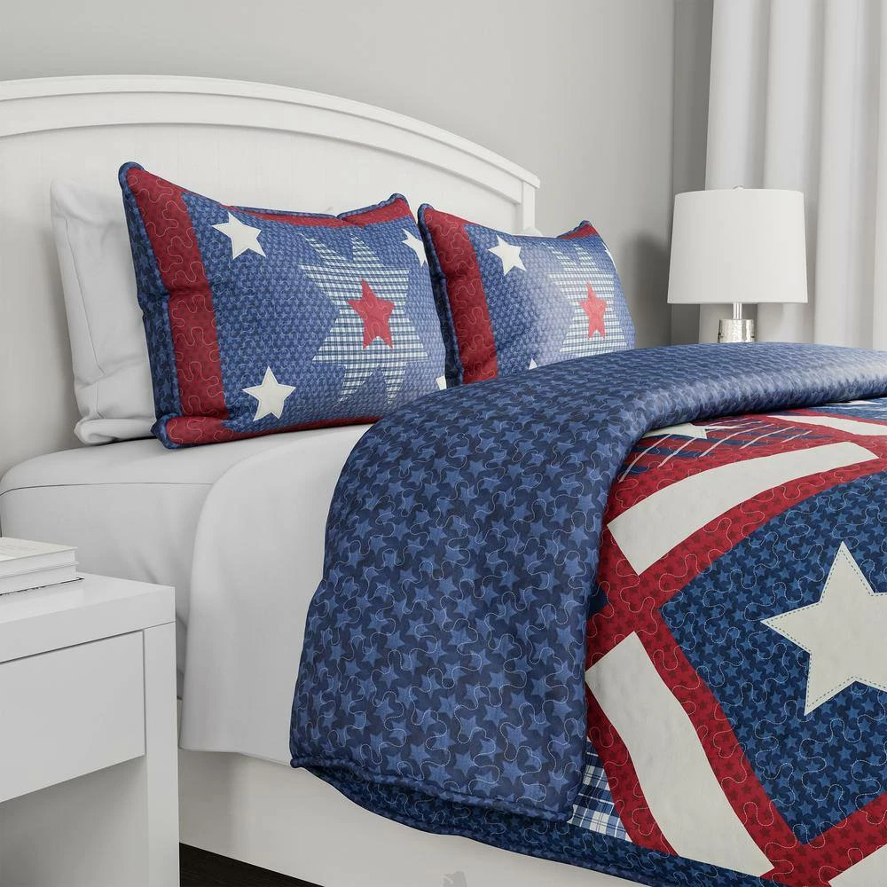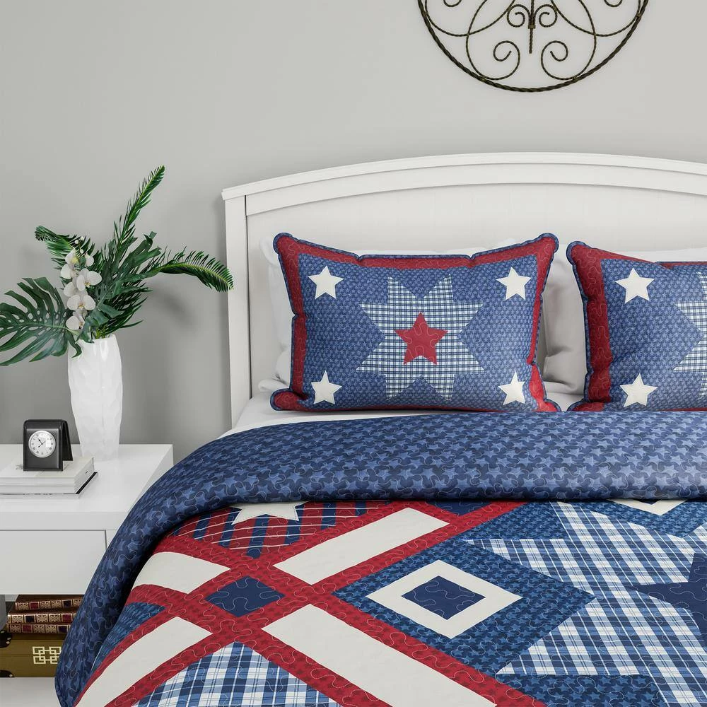 Dress your bed lavishly with the 3-Piece “Homestead” Americana Print Quilt and Bedding Set by Buckingham Home. This set features an exclusive patriotic design by Heather Dutton with an antiqued Americana themed face and repeating star pattern on the reverse and includes 2 matching pillow shams. The quilt is made with 100% polyester filling to provide the same warmth and comfort as a down comforter without triggering allergies. The bedspread and shams are breathable and lightweight enough for a cozy experience all year-round and are great for layering with other blankets and bedding. Both the quilt and shams are machine washable to help keep them beautiful and soft, night after night.