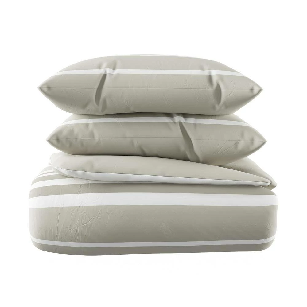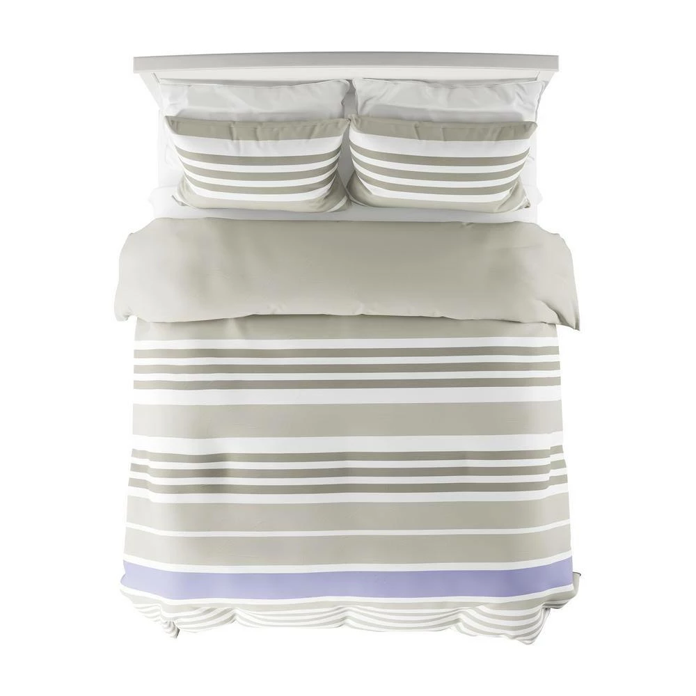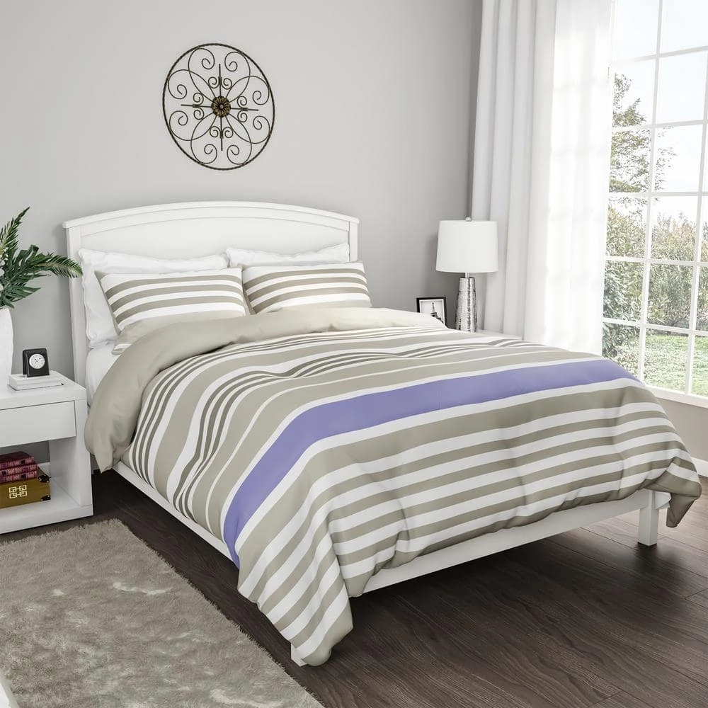 The 3-Piece Lavender and Sand Queen Comforter Set from Lavish Homes includes one queen comforter with two coordinated pillow shams. The reversible comforter features a striped design on one side with a solid color on the other. This lightweight bedding set is made of 100% polyester for warmth, breathability, and lasting comfort.