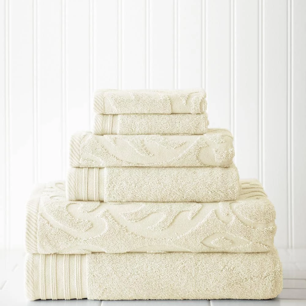 Indulge yourself in spa like luxury with this luxurious six-piece towel set. The set is made of cotton known for its softness, absorbency, and durability. These towels make an ideal complement to any bathroom whether you use it to pamper yourself or reserve it for special guests. cotton fibers are valued for their superior length and strength, which also reduces the buildup of pile and lint. These Medallipon Swirl Jacquard towels will feel cozy and comfortable against your skin every time you use them. Additionally the towels get softer with washing and drying. Bath- 27 in. x 54 in., Hand- 16 in. x 28 in., Wash- 13 in. x 13 in.