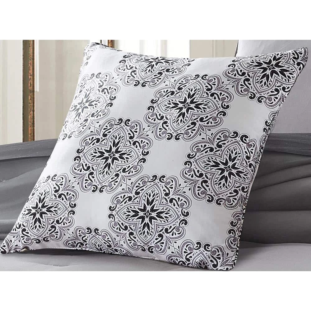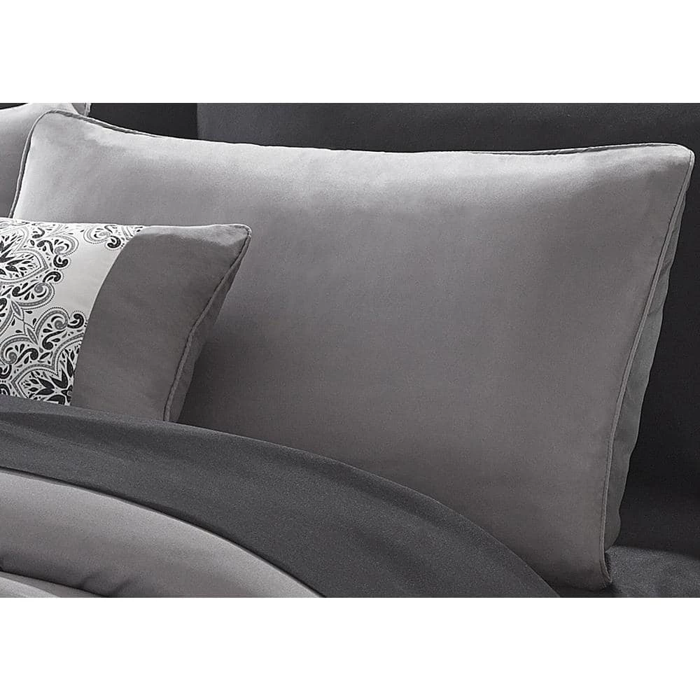 - Set includes a comforter, two shams, two pillowcases, a fitted sheet, a flat sheet, a square decorative pillow, and a lumbar decorative pillow
