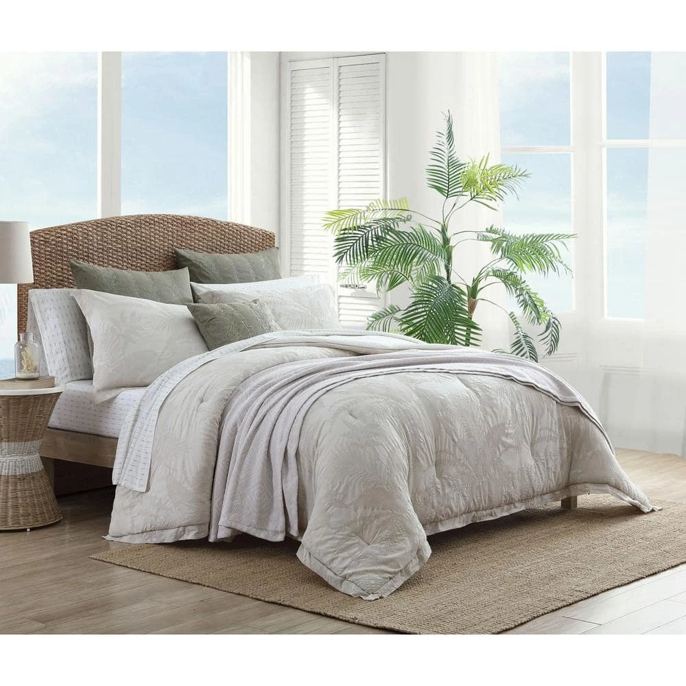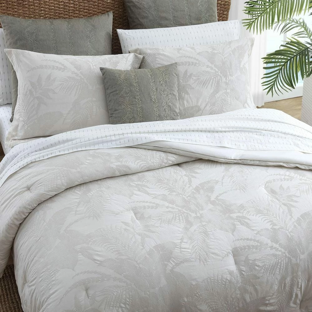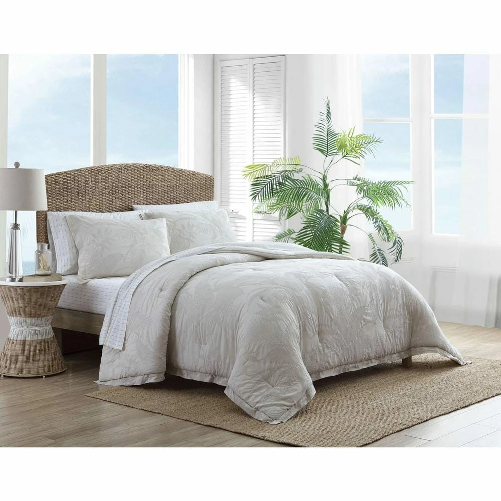 Incredibly soft and inviting in soothing shades of ivory, the Abalone Comforter Set from Tommy Bahama is a welcome update to your bedroom. This gorgeous comforter set features a modern botanical design with a distressed washed finish and stylish flange edges. Prewashed for added softness, this all-cotton ensemble is perfect for creating a tropical escape. Comforter features a polyester fill and the set is machine washable for easy care. Queen comforter set includes: 1-comforter 96 in. L x 92 in. W, 1-bedskirt 80 in. L x 60 in. W and 2-shams 21 in. L x 27 in. W. King comforter set includes: 1-comforter 96 in. L x 110 in. W, 1-bedskirt 80 in. L x 78 in. W and 2-shams 21 in. L x 37 in. W. California King comforter set includes: 1-comforter 96 in. L x 110 in. W, 1-bedskirt 84 in. L x 72 in. W and 2-shams 21 in. L x 37 in. W.