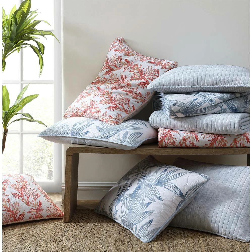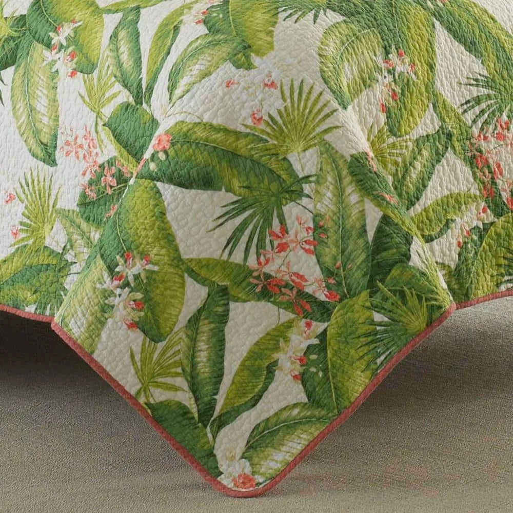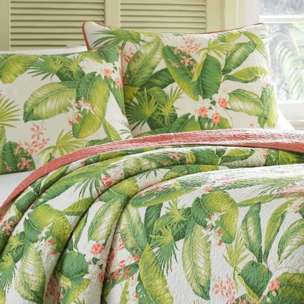 Our Tommy Bahama aregada dock quilt was inspired by a tropical oasis. Our Tommy Bahama aregada dock quilt features a green palm leaf design on an ecru ground with a coral pink reverse. This quilt is 100% cotton, with a cotton (80%)/polyester (20%) filling, lightweight and easy to layer. The shams feature a two piece back closure. The corners of the quilt are rounded to match the sham, both edges are finished with a fabric binding. This quilt set is fully reversible. We have reduced our packaging, eliminating all plastic. Your quilt set will arrive secured with a ribbon. The set includes 1 quilt and 2 shams (1 sham for the twin set). Machine washable, for easy care.