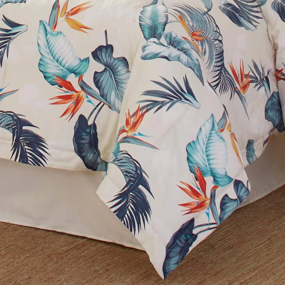 - Beautiful Tropical Florals of blues, turquoise and coral come together on an off-white comforter.