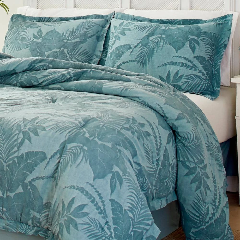 - Beautiful Blues woven together to look like a solid comforter but with subtle tropical palm design.