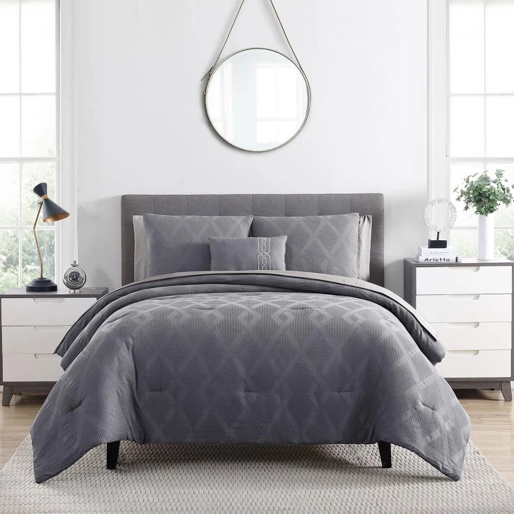This handsome set features a beautifully unique waffle texture with a jacquard interlocking diamond design, creating a great look for any bedroom. The soft hand fabric is on both the comforter and face of the shams. The solid coordinating back allows you to use the comforter on either side for a different look. This mid tone grey palette can work with any style of decor, lending itself best to a more modern and contemporary appearance.