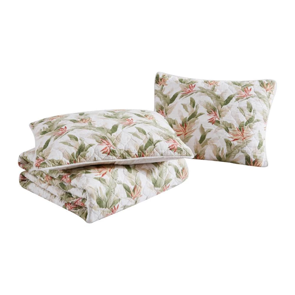 Our Tommy Bahama Hawaiian Royal quilt features yellow and orange tropical flower with a green leaf motif on an ivory ground, reversing to a beautiful solid ivory. This quilt is 100% cotton, with a cotton (80%)/polyester (20%) filling, lightweight and easy to layer. The shams feature a two piece back closure, that is seamles and easy to take on and off. The corners of the quilt are rounded to match the sham, and both edges are finished with a fabric binding. We have reduced our packaging by eliminating all plastic; instead of plastic your quilt set will arrive secured with a ribbon. The set includes 1 quilt and 2 shams (1 sham for the twin set) and is machine washable, for easy care.