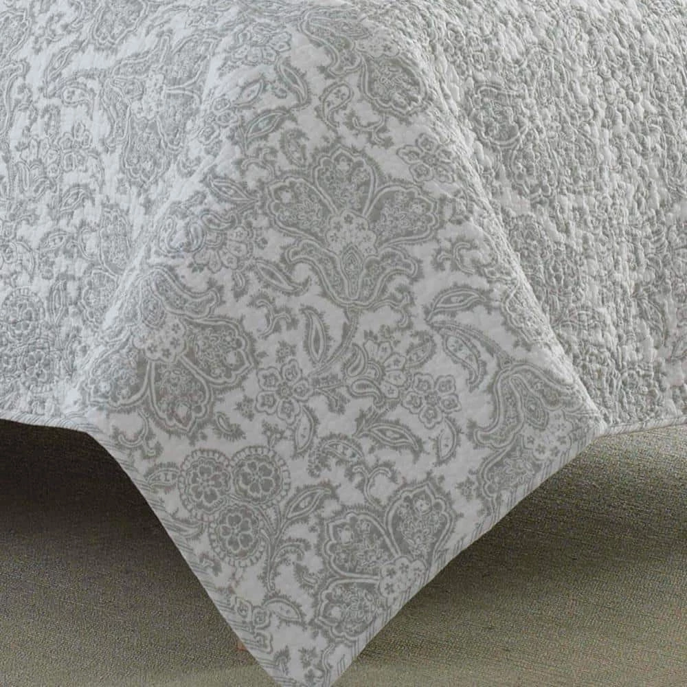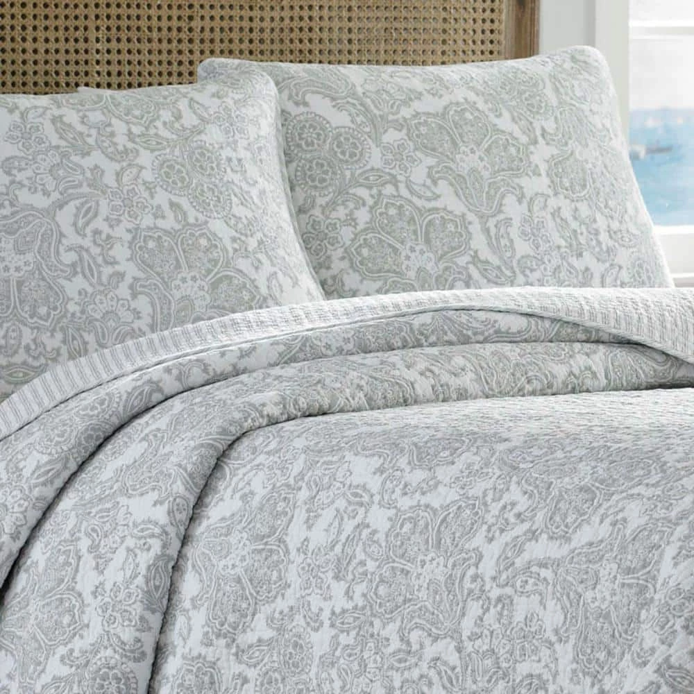Our Tommy Bahama island memory quilt features a grey floral patterned design printed on a light grey ground with a grey striped reverse. This quilt is 100% cotton, with a cotton (80%)/polyester (20%) filling, lightweight and easy to layer. The shams feature a two piece back closure. The corners of the quilt are rounded to match the sham, both edges are finished with a fabric binding. This quilt set is fully reversible. We have reduced our packaging, eliminating all plastic. Your quilt set will arrive secured with a ribbon. The set includes 1 quilt and 2 shams (1 sham for the twin set). Machine washable, for easy care.