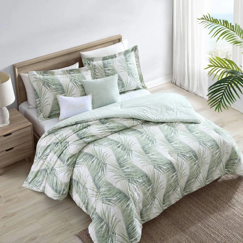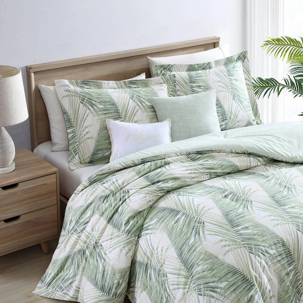 - Our Tommy Bahama Kauai comforter bonus set features a green palm leaf pattern on an ivory ground; The reverse is solid light green; The square breakfast pillow matches the comforter reverse, while the oblong breakfast pillow says ‘relax’ with natural colored embroidery and cording