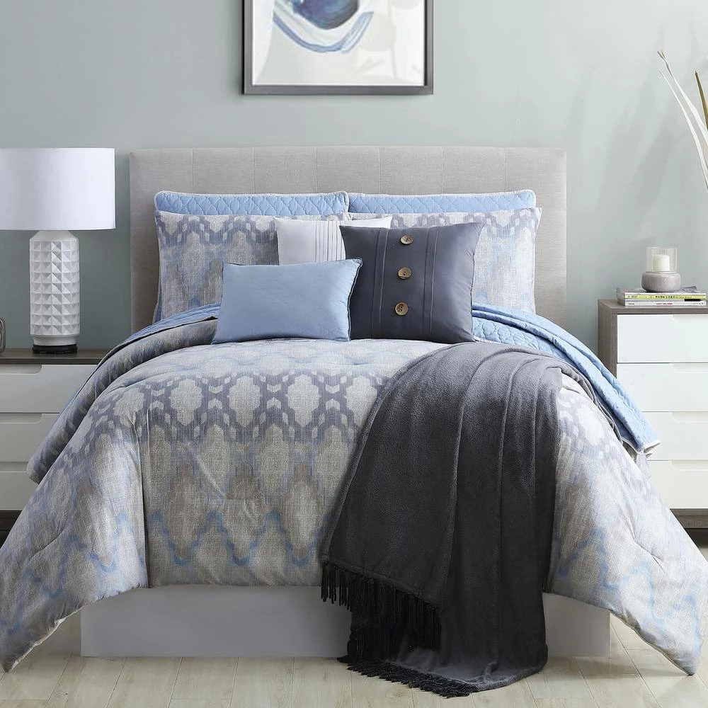 Create a comfortable yet casual look in your bedroom with this muted geometric design in all shades of blues and greys. Spa like colors blended in a textured geometric motif make for a clean and classic room. All of the items included in the set work together for a complete designer look. This 10-piece set allows you to dress 2-rooms, mixing and matching the elements as you like. The comforter and matching shams reverse to a soft neutral grey. The coverlet set is quilted in the same pattern as in the print for a completely coordinated look and year round comfort. Choose to use this coverlet as a layering piece or in a second bedroom on its own. Throw pillows accent the colors in the bedding to finish the effect and make the space more comfortable. These 3-decorative pillows are designed with refined styling for a more modern and updated appearance, coordinating beautifully with the set. To top it off, we have included a soft plush throw with chenille fringe to cozy up with in bed or your favorite reading chair. We love this 10-piece set, it is like having 2-rooms in one. Perfect for year- round use, as you get to mix and match as you like.