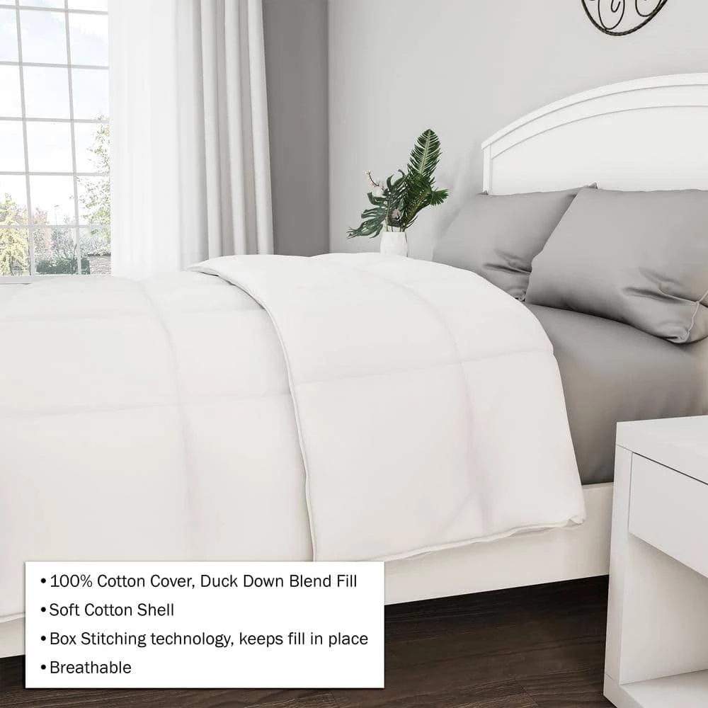 - PRODUCT DETAILS- Material: 100% Cotton Shell & Duck Down Feather Blend Fill. Dimensions (L) 86″ x (W) 66″. Fits Twin Size Beds. Care Instructions: Dry Clean Only. Color: White.