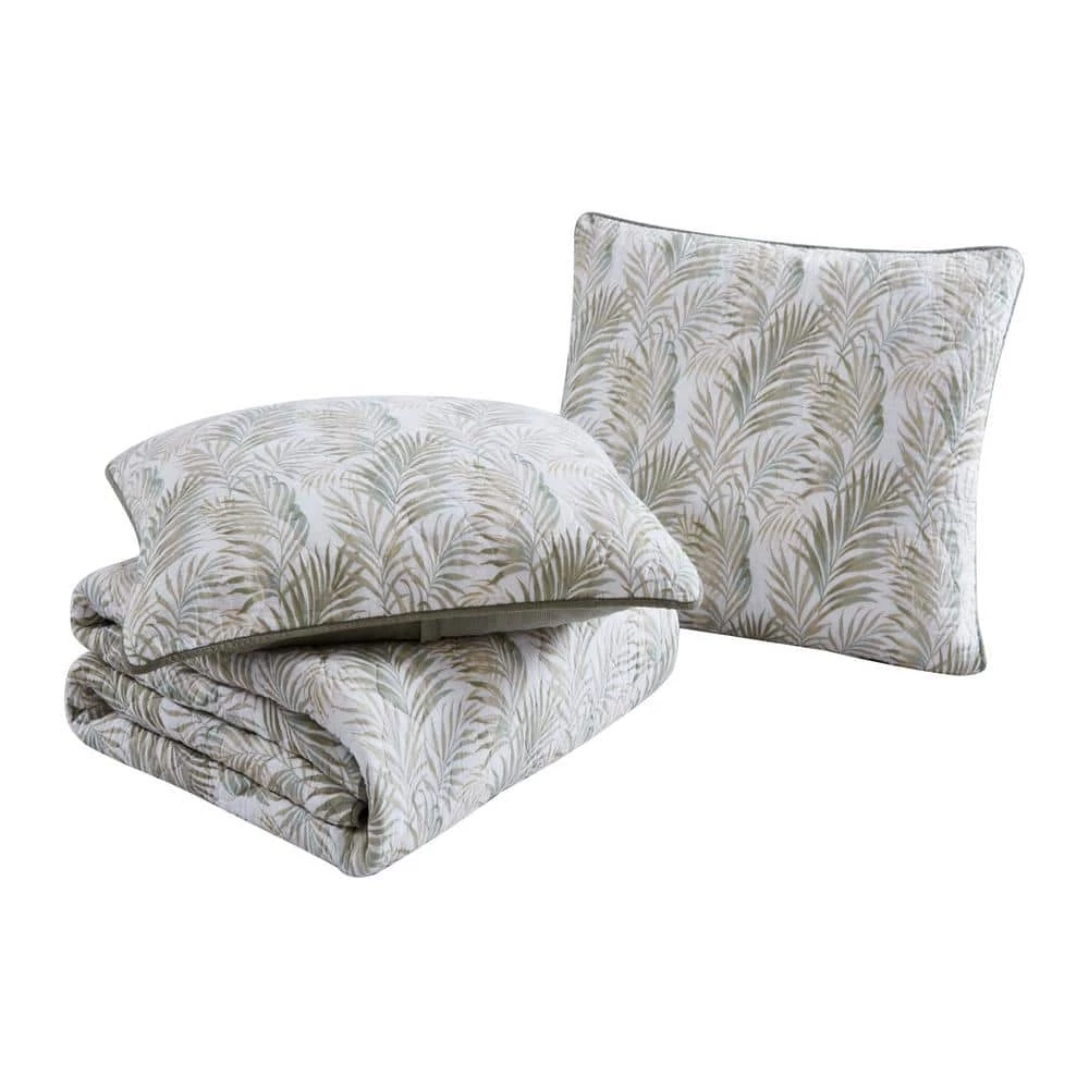 Our Tommy Bahama Maui Palm quilt features a printed sage palm leaf motif on a white ground, reversing to a beautiful solid sage. This quilt is 100% cotton, with a cotton (80%)/polyester (20%) filling, lightweight and easy to layer. The shams feature a two piece back closure, that is seamles and easy to take on and off. The corners of the quilt are rounded to match the sham, and both edges are finished with a fabric binding. We have reduced our packaging by eliminating all plastic; instead of plastic your quilt set will arrive secured with a ribbon. The set includes 1 quilt and 2 shams (1 sham for the twin set) and is machine washable, for easy care.