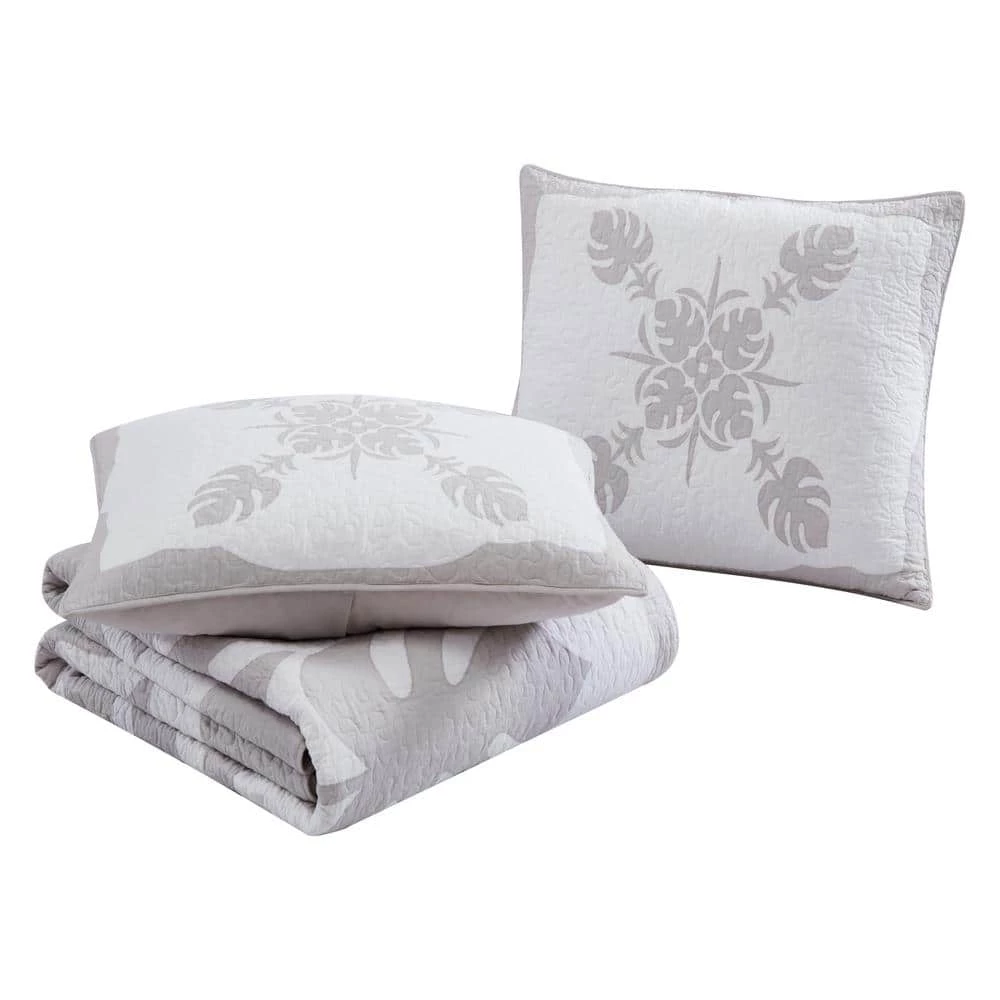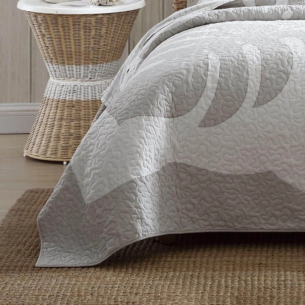 Our Tommy Bahama Molokai quilt was inspired by the tropical island in hawaii. Our Tommy Bahama Molokai quilt features embroidered tropical motifs in a beautiful greey color on a quilted white ground. The reverse is grey. This quilt is 100% cotton, with a cotton (80%)/polyester (20%) filling, lightweight and easy to layer. The shams feature a two piece back closure. The corners of the quilt are rounded to match the sham, both edges are finished with a fabric binding. This quilt is fully reversible. We have reduced our packaging, eliminating all plastic. Your quilt set will arrive secured with a ribbon. Quilt and shams are sold separately. Machine washable, for easy care.