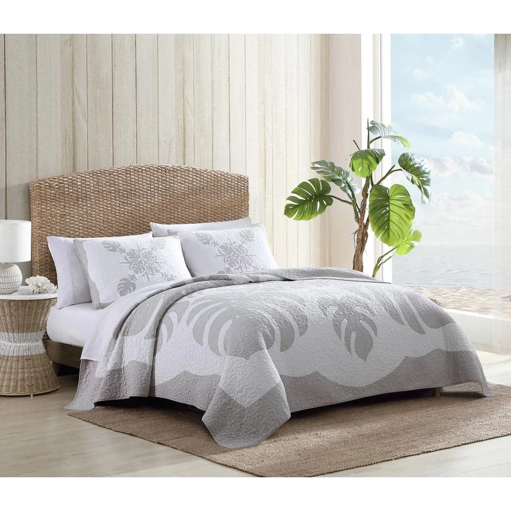 - Our Tommy Bahama molokai quilt features embroidered tropical motifs in a beautiful grey color on a quilted white ground; the reverse is solid grey; this quilt is traditional yet tropical with it’s unique border design; shams feature grey cording to coordinate with reverse