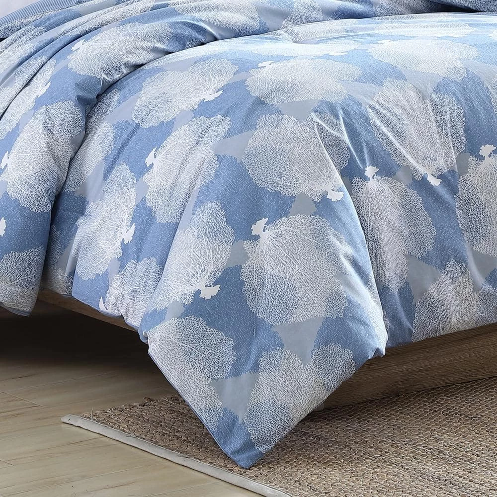 Our Tommy Bahama ohana comforter bonus set features a white coral design on a blue ground. The reverse is blue. The square breakfast pillow matches the comforter reverse, while the oblong breakfast pillow says ‘sea’ on a watercolor blue. The included comforter is 100% cotton with an 8 oz. Polyester fill. Full/queen comforter set includes 1 comforter, 2 standard shams and 2 decorative pillows; king comforter set includes 1 comforter, 2 king shams and 2 decorative pillows. STANDARD 100 by OEKO-TEX, an independent certification system that ensures textiles meet high safety and environmental standards. Machine washable for easy care.