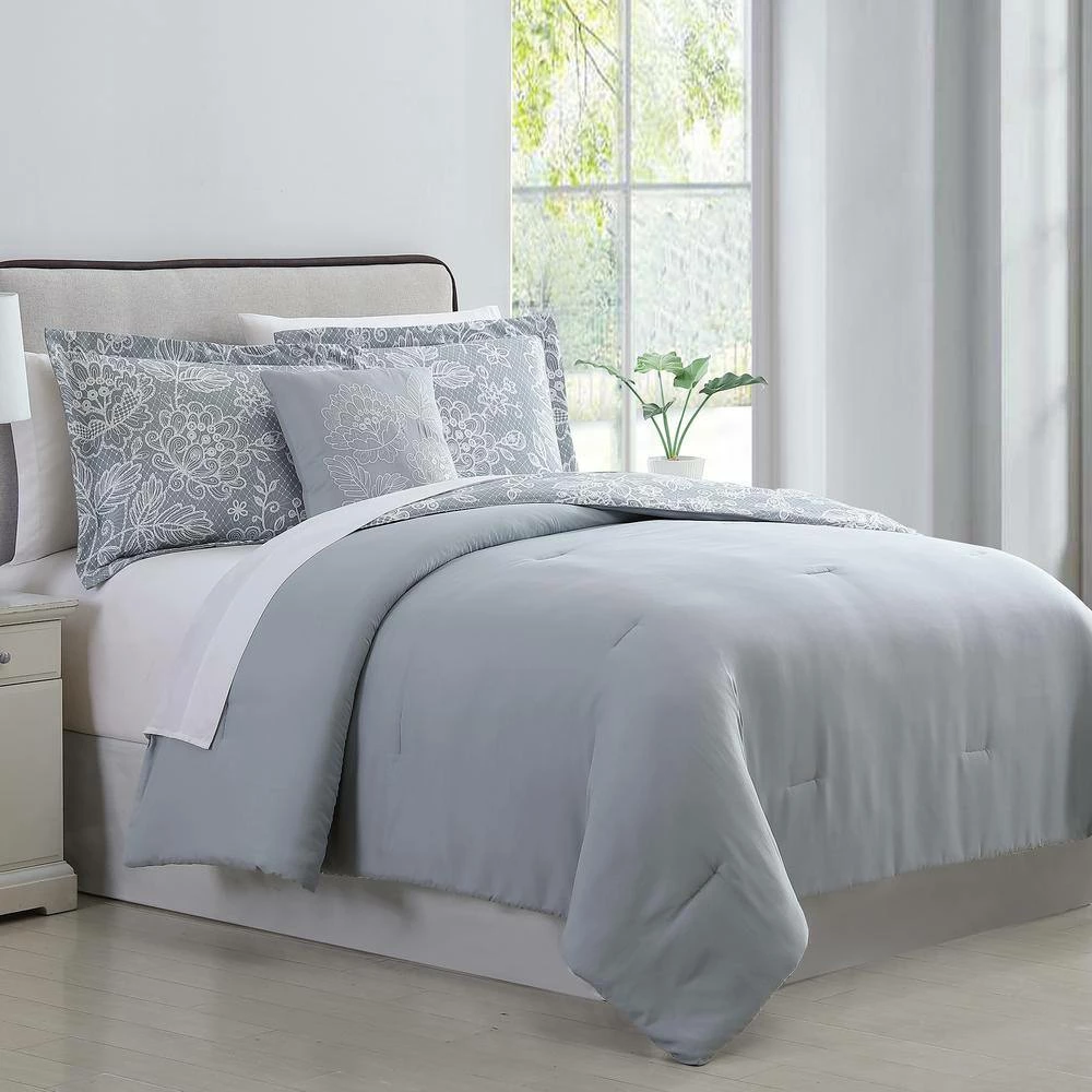 Add a touch of subtle elegance to your sleeping space with this charming feminine-inspired bedding set. The Olivia eight piece bed in a bag set features a delicate lace-like floral pattern in classic white and grey colors that look great in any room. This set is crafted with polyester materials and includes everything you need to complete the look of your bedding ensemble including a sheet set and embroidered decorative pillow. Maintain the look of your new comforter set by simply tossing it in the washing machine for a quick freshen up.