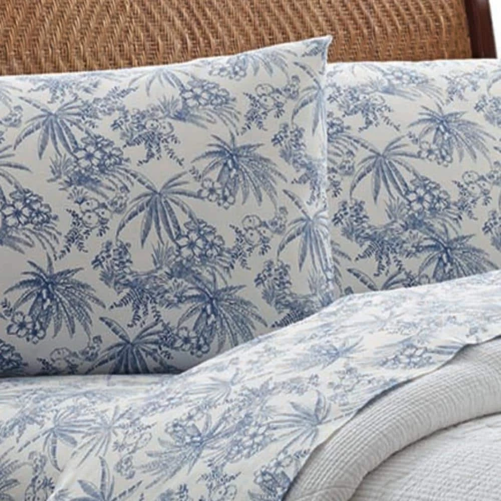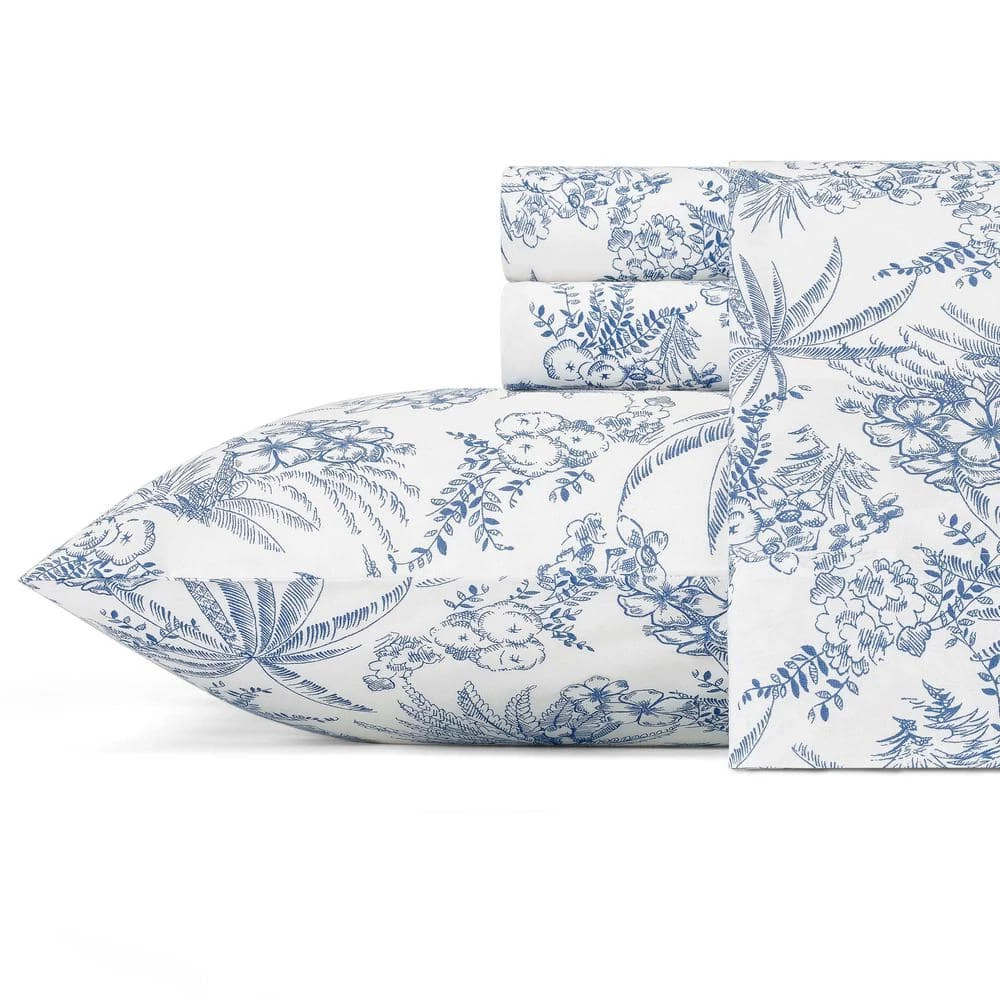 Update your bedding ensemble with the Tommy Bahama pen and ink cotton sheet set. A classic palette of blue and white lends timeless appeal to this relaxed tropical toile print. The pen stroke renderings of palm trees and tropical flora evoke an exotic landscape captured in an artist’s sketchbook. These 100% percale cotton woven sheets are soft and comfortable with a 200-thread count. Top of the line materials and construction means these sheets will last. Sheet set is machine washable for easy care. Set includes a fully elasticized fitted sheet that prevents slipping from your mattress and ensures a perfect fit. Fitted sheet fits mattress 15 in. Deep. Twin sheet set includes: 1-flat sheet (96 in. L x 66 in. W), 1-fitted sheet (75 in. L x 39 in. W) and 1-pillowcase (20 in. L x 30 in. W). Full sheet set includes: 1-flat sheet (96 in. L x 81 in. W), 1-fitted sheet (75 in. L x 54 in. W) and 2-pillowcases (20 in. L x 30 in. W). Queen sheet set includes: 1-flat sheet (102 in. L x 90 in. W), 1-fitted sheet (80 in. L x 60 in. W) and 2-pillowcases (20 in. L x 30 in. W). King sheet set includes: 1-flat sheet (102 in. L x 108 in. W), 1-fitted sheet (80 in. L x 78 in. W) and 2-pillowcases (20 in. L x 40 in. W). California king set includes: 1-flat sheet (102 in. L x 108 in. W), 1-fitted sheet (84 in. L x 72 in. W) and 2-king pillowcases (20 in. L x 40 in. W).