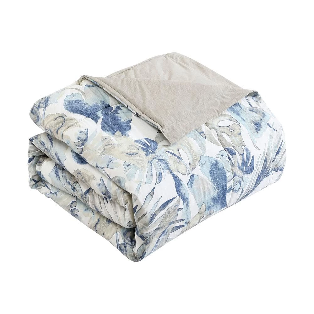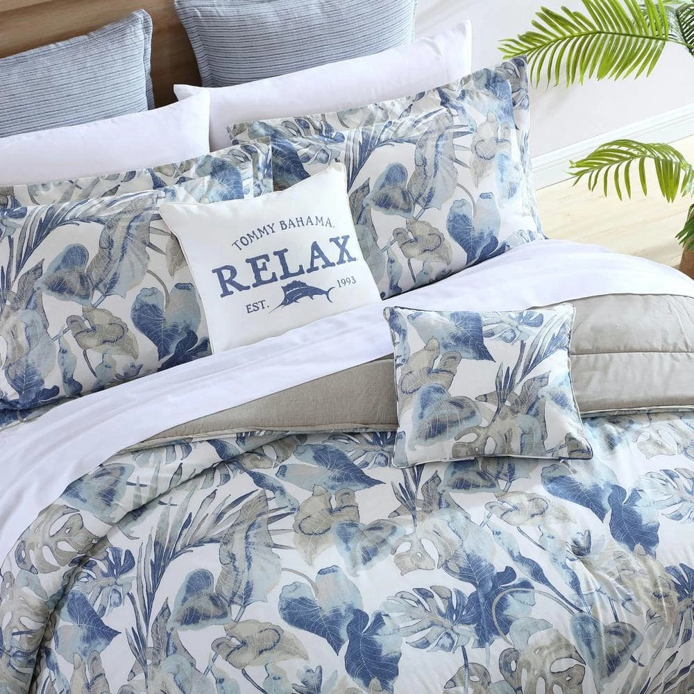 Tropical foliage is interpreted in a painterly watercolor style that brings a fresh, contemporary vibe to this signature design. Tones of indigo and chambray blues with neutral khaki on a warm white ground create a pleasing palette that is easy to coordinate. Accessory accents such as detail stitched European shams and logo decorative pillows add an authentic Tommy Bahama signature to complete the look. Comforter is machine washable for easy care. Queen set measures: Comforter- 96″L x 92″W, Standard Shams- 21″L x 27″W; Bed skirt – 80″ L x 60″W, 15″ drop. King set measures: Comforter-96″L x 110″W, King Shams- 21″L x 37″W, Bed skirt -80″L x 78″W, 15″ drop.