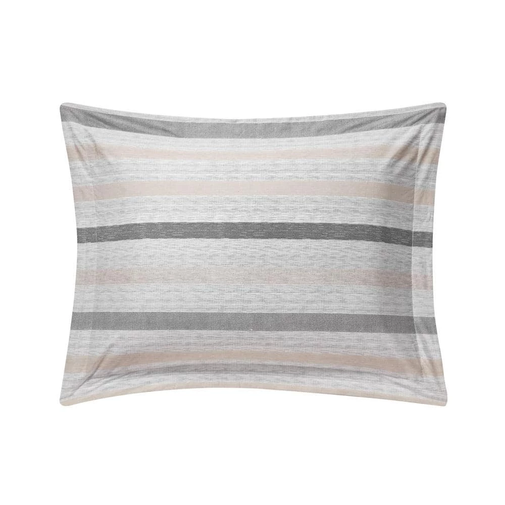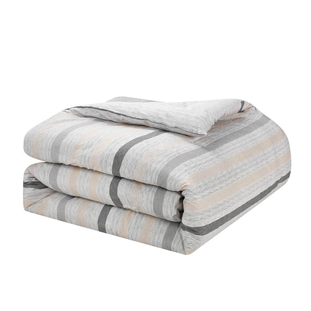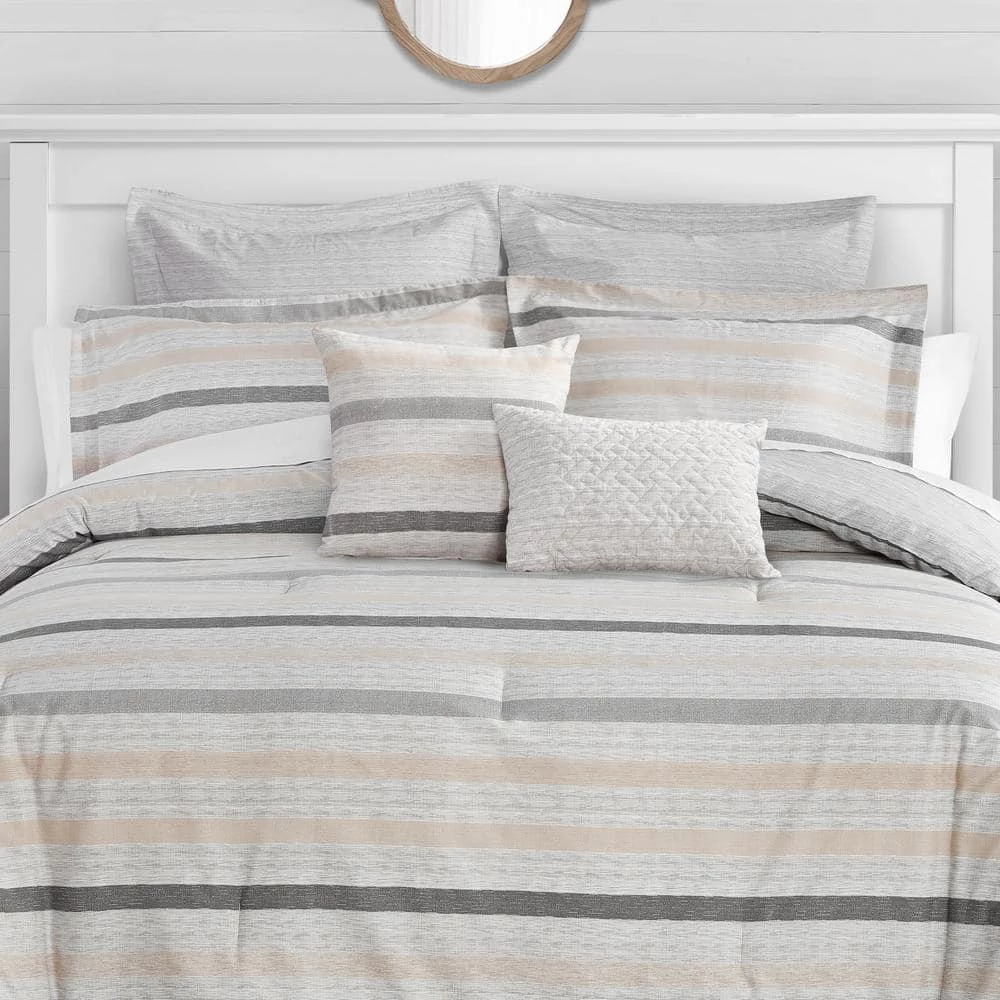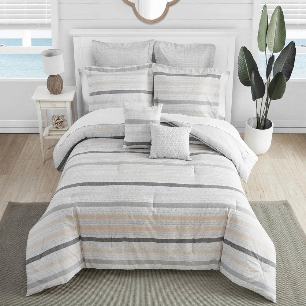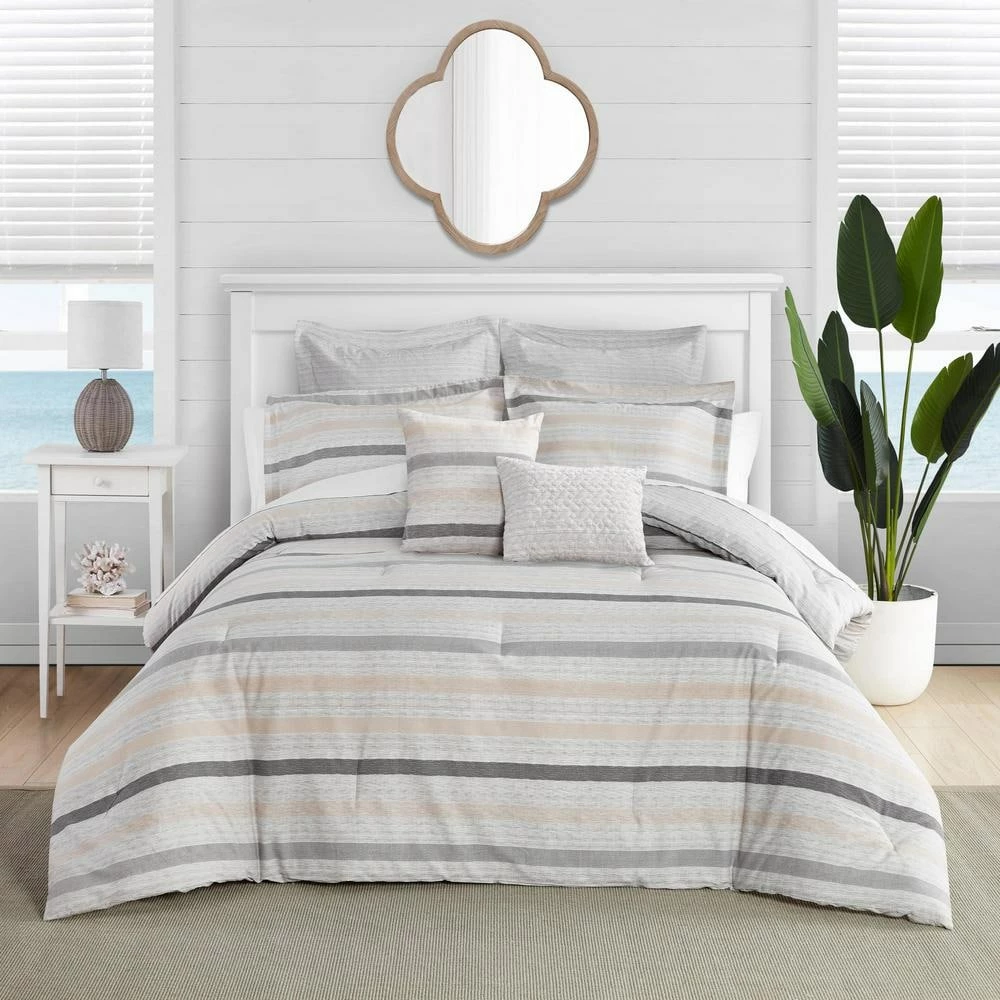 Incredibly soft and inviting in soothing neutral shades grey and beige, the sandy beach cotton comforter bonus set from Tommy Bahama is a welcome update to your bedroom. This comforter set features horizontal stripes in shades of grey and beige on a printed textured ground. The reverse features a grey printed textured ground. The comforter is 100% cotton with an 8 oz. Polyester fill. Our products are crafted with you in mind, this comforter set is STANDARD 100 by OEKO-TEX tested against a list of 350 harmful substances, resulting in a chemical free item. The set includes 1 comforter, 2 shams, 2 European shams, 1 square pillow and 1 breakfast pillow. Ensemble is machine washable for easy care.
