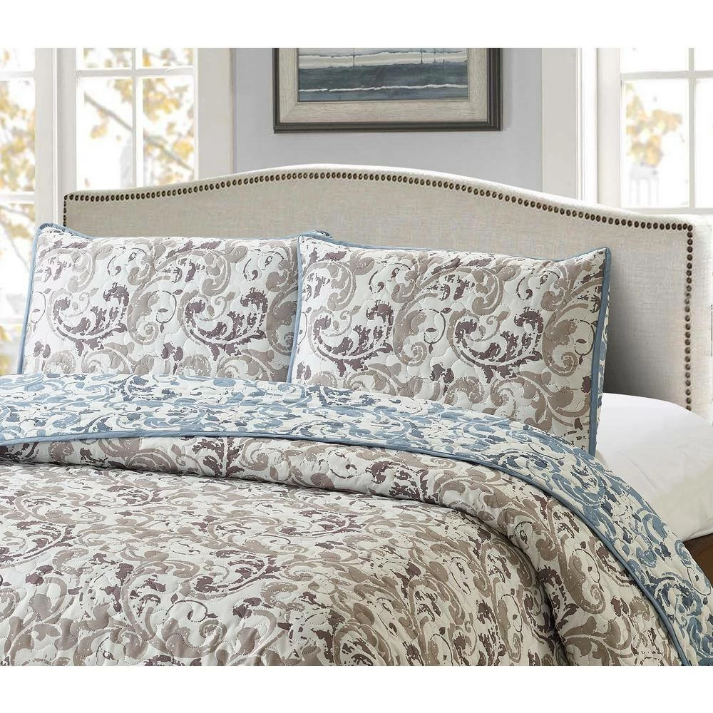 Upgrade your bedroom esthetic, with this 3-piece quilt set. This microfiber set includes 1 quilt, and 2 pillow shams. A stunning print on the front and reverse, makes this set great for 2 looks. All items are machine washable for easy care. Features: Set includes 1 quilt, and 2 shams (1 sham in twin size) Lightweight Reversible Machine washable Shell: Polyester Microfiber Poly filled Twin Dimensions Quilt: 68 in. wide x 86 in. long Sham: 20 in. wide x 26 in. long Full / Queen Dimensions Quilt: 88 in. wide x 92 in. long Shams: 20 in. wide x 26 in. long King Dimensions Quilt: 106 in. wide x 92 in. long Shams: 20 in. wide x 36 in. long Country of Origin: China.