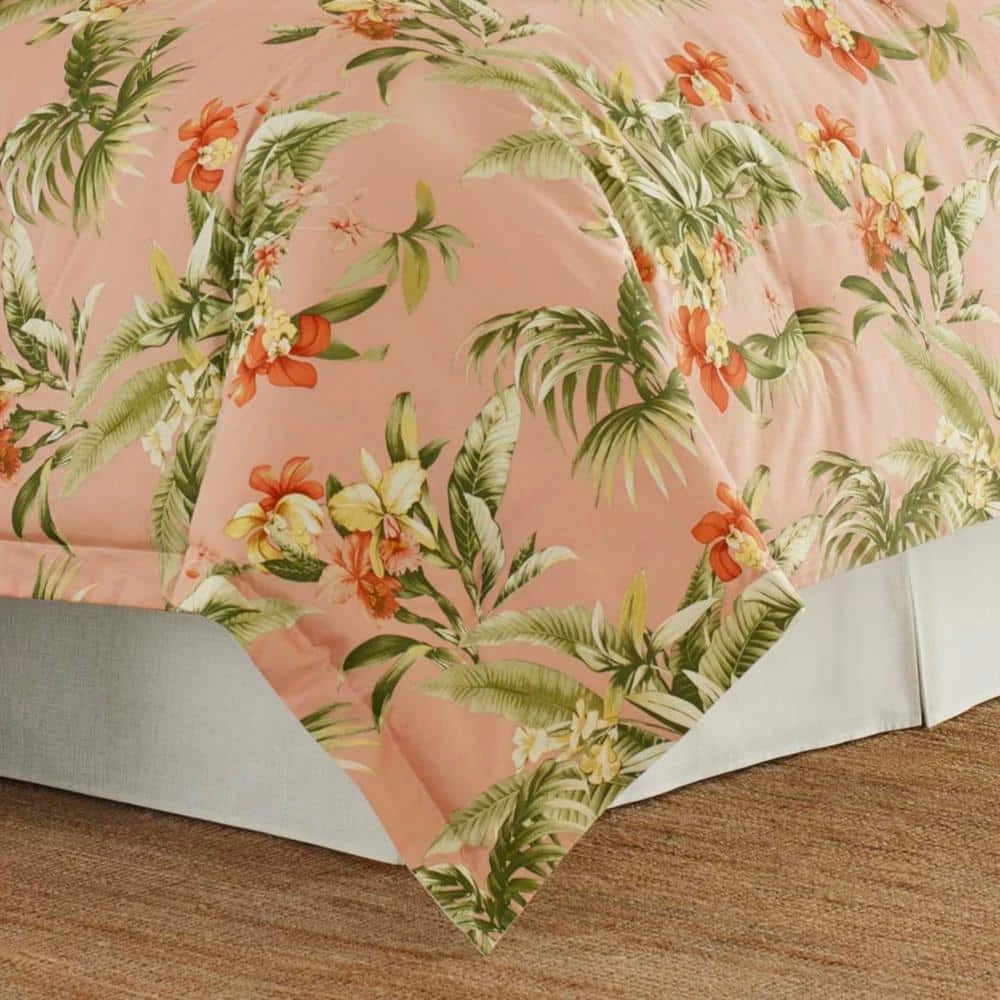 Update your bedding ensemble with the Tommy Bahama siesta key cotton comforter set. Create an island oasis no matter where you call home with this all cotton, sun-drenched botanical print. Tropical leaves and wild orchids in a refreshing palette of warm corals, pale yellow and leafy greens are set against a rosy background of coral pink, lending the luminous glow of a tropical sunset. A white cotton eyelet accent pillow and European shams add a romantic, feminine touch and additional decorative pillows with pineapple and floral embroidery enhance the island mood. Layer in our pineapple stripe cotton sheet set to complete the look. The comforter set is machine washable for easy care. Queen comforter set includes: one comforter (96″l x 92″w), one queen tailored bed skirt (80″l x 60″w), and two standard shams (21″l x 27″w). King comforter set includes: one comforter (96″l x 110″w), one king tailored bed skirt (80″l x 78″w), and two king shams (21″l x 37″w). California king set includes: one comforter (96″l x 110″w), one California king tailored bed skirt (84″l x 72″w), and two king shams (21″l x 37″w).