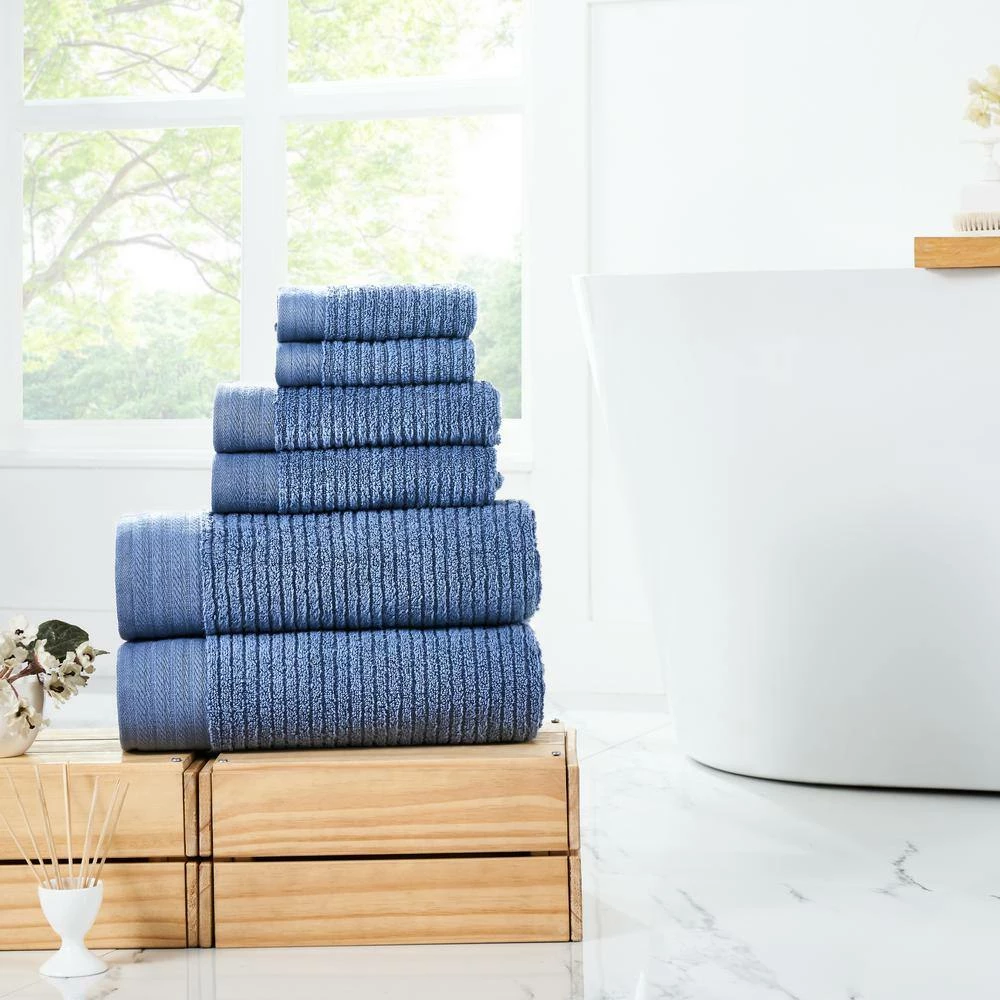 - 6-piece towel set includes 2-bath towels, 2-hand towels, and 2-washcloths