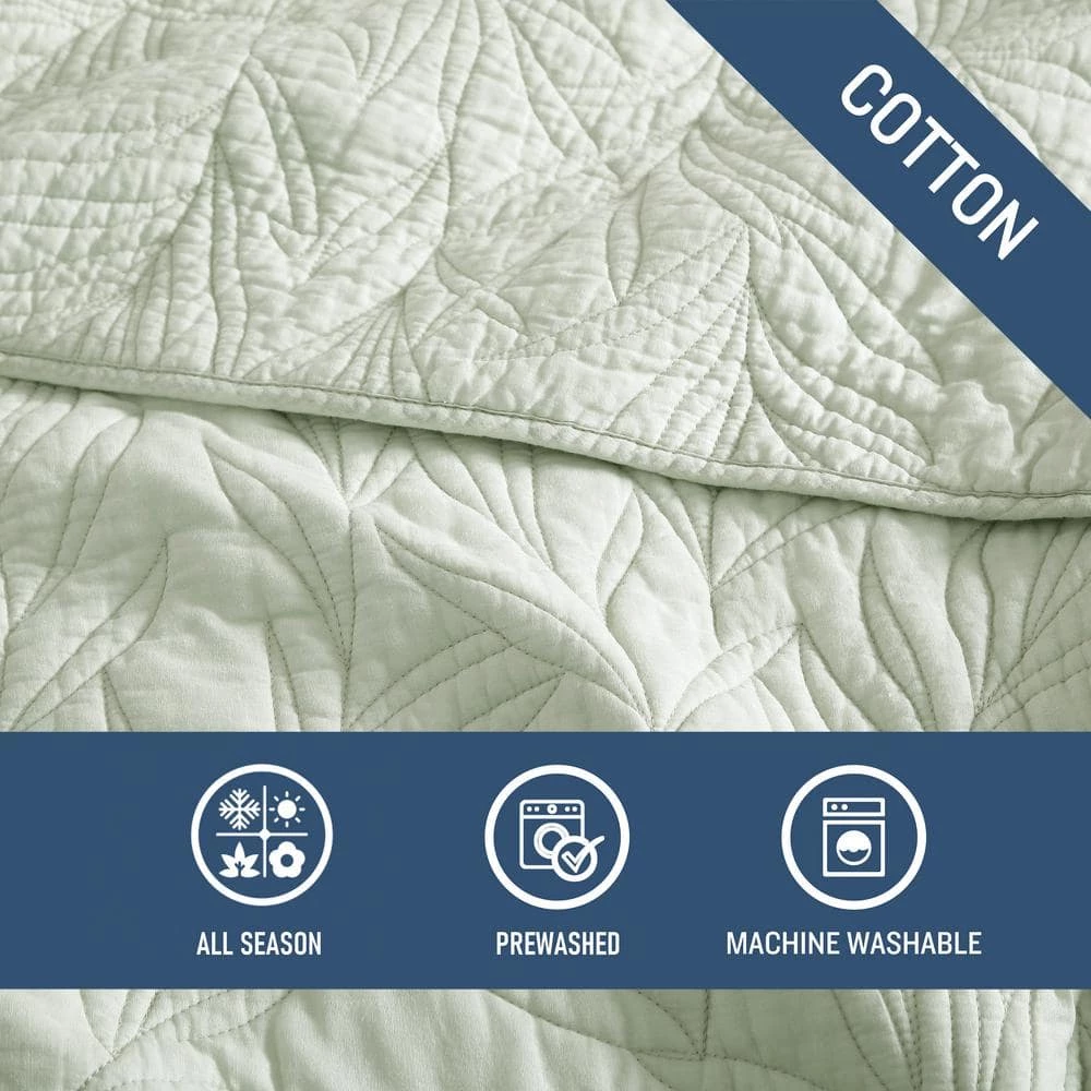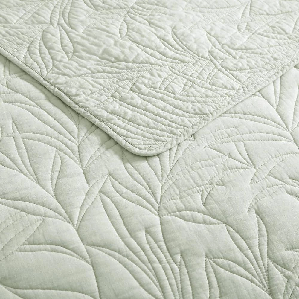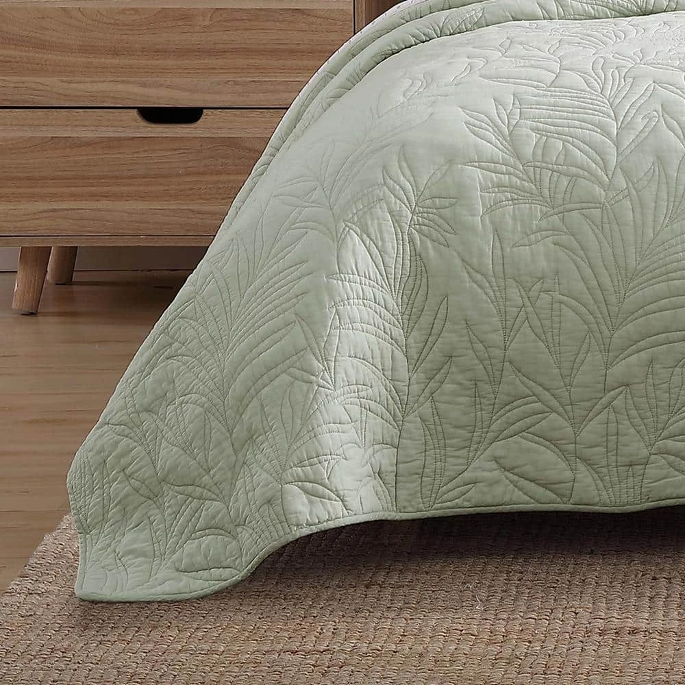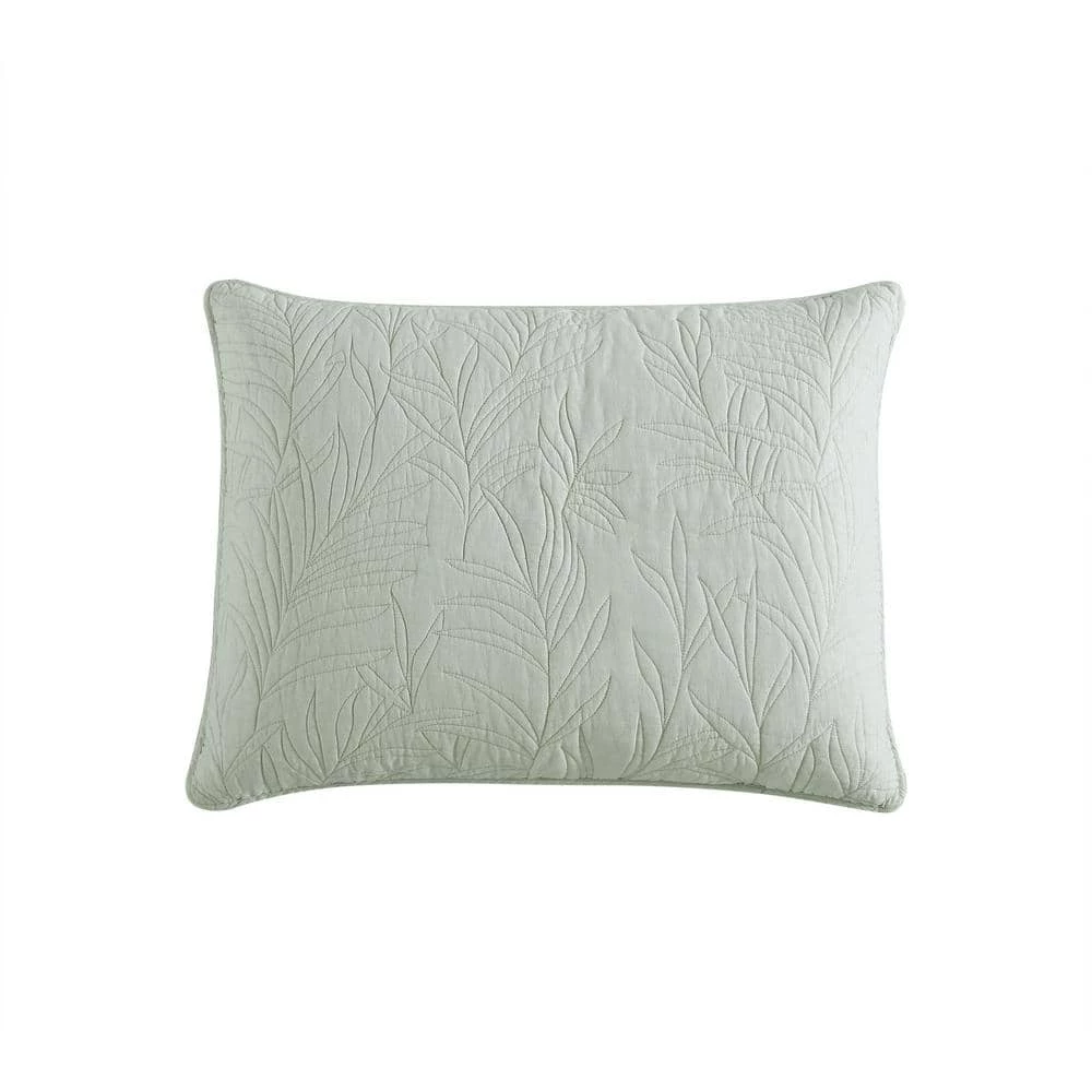 Our Tommy Bahama costa sera quilt was inspired by a relaxing coastal retreat. This quilt features a subtle floral quilt stitch on a sage green ground. The reverse is sage green. This quilt is 100% cotton, with a cotton (80%)/polyester (20%) filling, lightweight and easy to layer. The shams feature a 2 in. self flange, the corners of the quilt are rounded and finished with a fabric binding. This quilt is fully reversible. We have reduced our packaging footprint to be more sustainable. Your quilt will arrive secured with a ribbon. Quilt and shams are sold separately. Machine washable, for easy care.