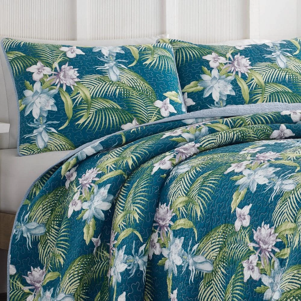Inspired by southern coastal cities, our Tommy Bahama southern breeze quilt features tropical florals in blues and purples and palm leaves in green on an indigo ground. The reverse is blue.this quilt is 100% cotton, with a cotton (80%)/polyester (20%) filling, lightweight and easy to layer. The shams feature a two piece back closure. The shams and quilt feature rounded edges and are finished with a fabric binding. This quilt set is fully reversible. We have reduced our packaging, eliminating all plastic. Your quilt set will arrive secured with a ribbon. The set includes 1 quilt and 2 shams (1 sham for the twin set). Machine washable, for easy care.