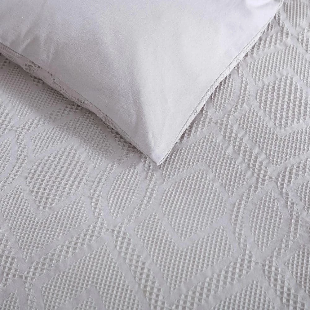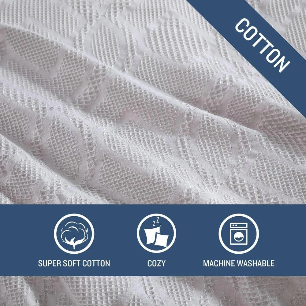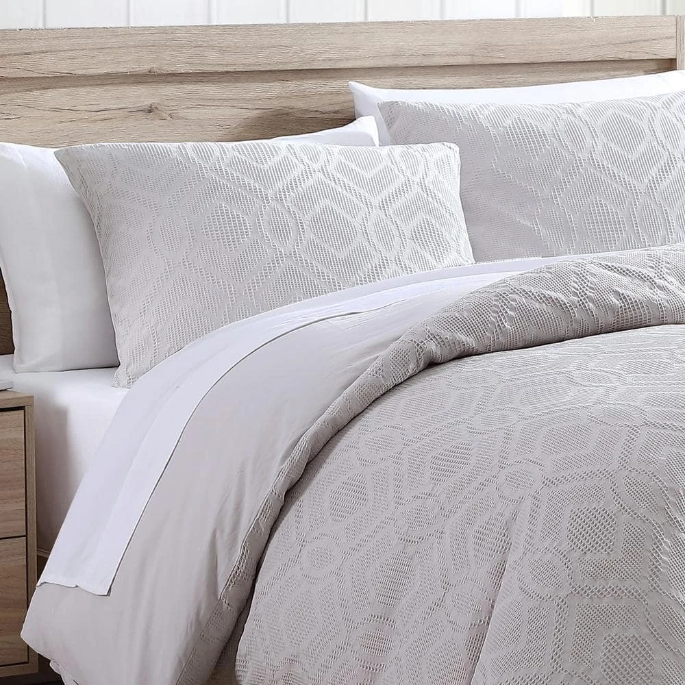 Transform your bedroom into a serene oasis with the Tommy Bahama Textured Waffle Duvet Cover Set. Constructed with quality cotton, this duvet cover set features a unique and subtle pastel grey geo textured design that will elevate any home decor. Duvet cover features a button closure and additional inner corner ties to secure your duvet insert in place during use. Duvet insert is not included and the set is machine washable for easy care.