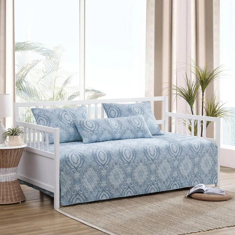 Add a touch of classic tropical decor to your guest room with Tommy Bahama turtle cove daybed cover set. This signature print features a multi blue and ivory geometric medallion print on a light blue ground. This daybed is 100% cotton, with a cotton (80%)/polyester (20%) filling, lightweight and easy to care for. The corners of the daybed are rounded to match the shams, both edges are finished with a fabric binding. Our products are crafted with you in mind, this daybed set is standard 100 by oeko tex certification tested against a list of 350 harmful substances, resulting in a chemical free item. This convenient set includes 1 daybed, 2 shams and 1 breakfast decorative pillow cover. Machine washable, for easy care.