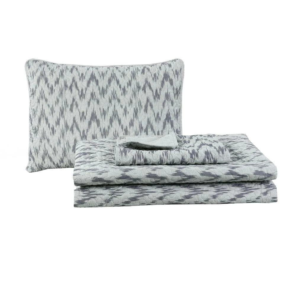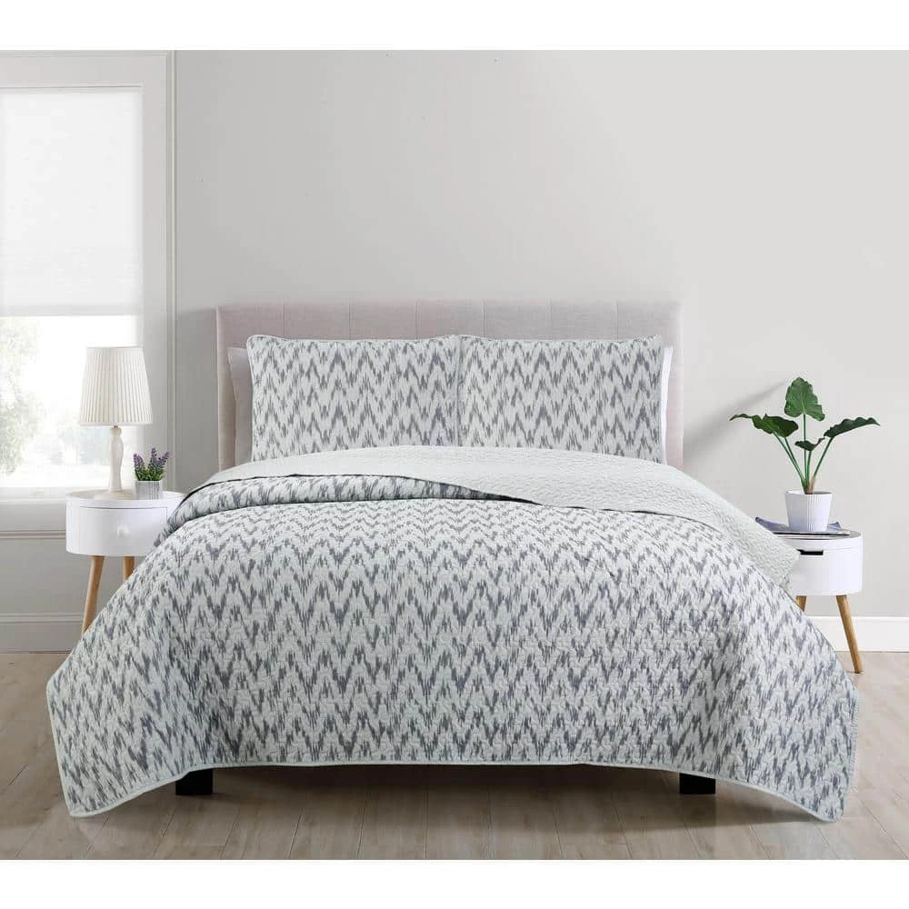 Upgrade your bedroom esthetic, with this 3-piece quilt set from Harper Lane. This microfiber set includes one quilt and two pillow shams with a subtle chevron print on the front, and reversed to a complimentary solid on the back. Each of these items is machine washable. Set includes 1 quilt and 2 shams (1 sham for the twin size) Lightweight Reversible Machine washable Shell: Polyester Microfiber Poly filled Full/Queen Dimensions Quilt: 90 inches wide x 90 inches long Shams: 20 inches wide x 26 inches long King Dimensions Quilt: 104 inches wide x 90 inches long Shams: 20 inches wide x 36 inches long
