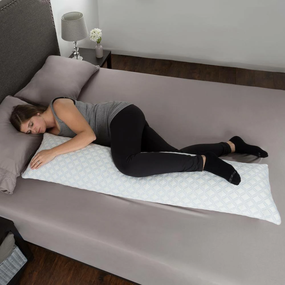 - REST COMFORTABLY – This pillow shapes to your body while staying cool to the touch, creating a comfortable environment for a well-rested sleep! The soothing foam pillow won’t go flat and is large and long enough to ensure support, alignment, and pain relief for your full body without crowding the bed. Memory foam body pillows are perfect to use if you are suffering from back pain, pregnancy discomfort, or aching legs, knees, shoulders and hips.