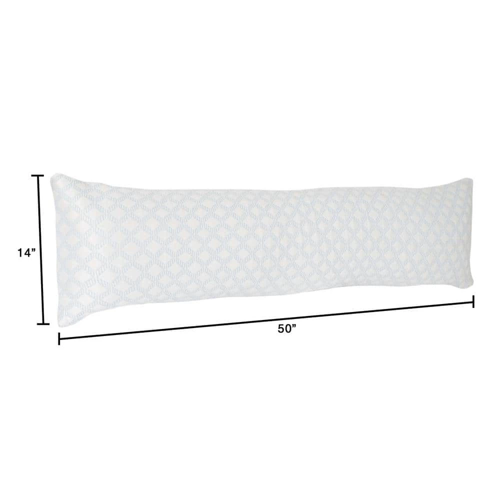 - PRODUCT DETAILS – Dimensions: 50″ (L) x 14″ (W). Protector Case color: White, Blue Embossed. Removable Cooling Cover Material: 44% Nylon, 56% Polyester. Pillow material: Shredded Polyurethane Foam encased in a layer of Solid Polyurethane Foam.